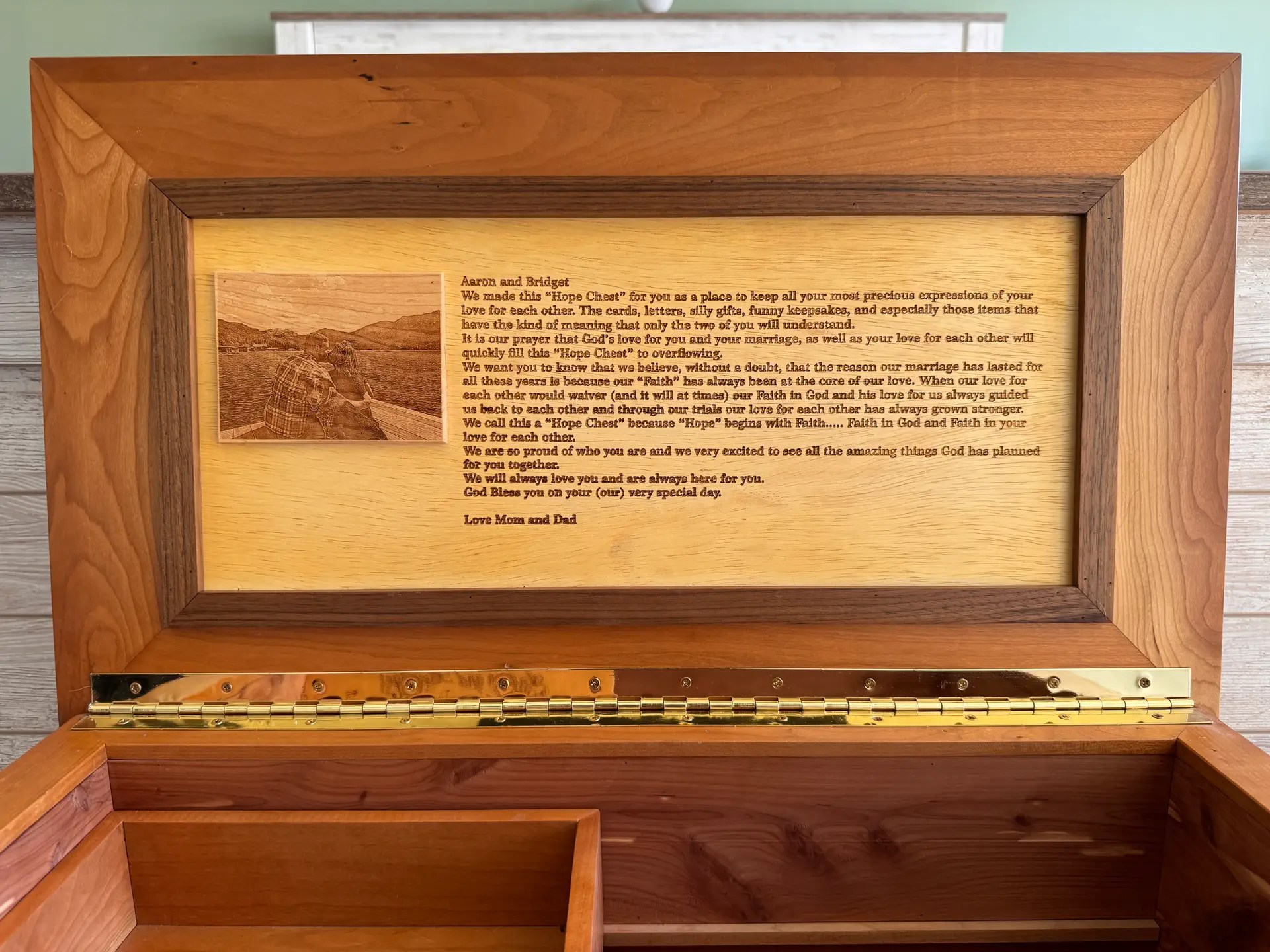 A custom hope chest is more than just a beautiful piece of handcrafted furniture—it’s a meaningful gift celebrating life’s biggest moments. Whether for a wedding, anniversary, graduation, or any special occasion, each hope chest is designed with care and attention to reflect the recipient’s personal story. Built to last for generations, these chests become cherished heirlooms, perfect for storing memories, keepsakes, and treasured items. To make each piece even more personal, we offer custom engravings—names, dates, quotes, or meaningful messages—carved directly into the wood. With Kurt’s expert craftsmanship and your personal input, you’re giving a gift that holds not only physical treasures but also a deep emotional connection, all captured in a timeless, engraved masterpiece.