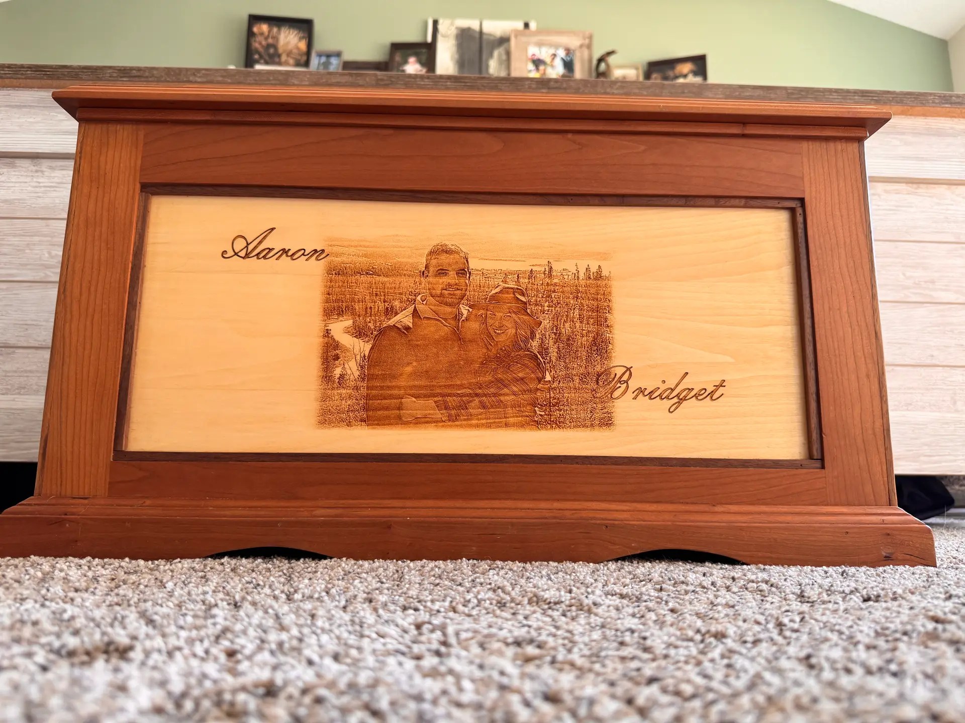 We can personalize the front, sides, back, top and under the lid with engraved pictures, last names, and/or messages